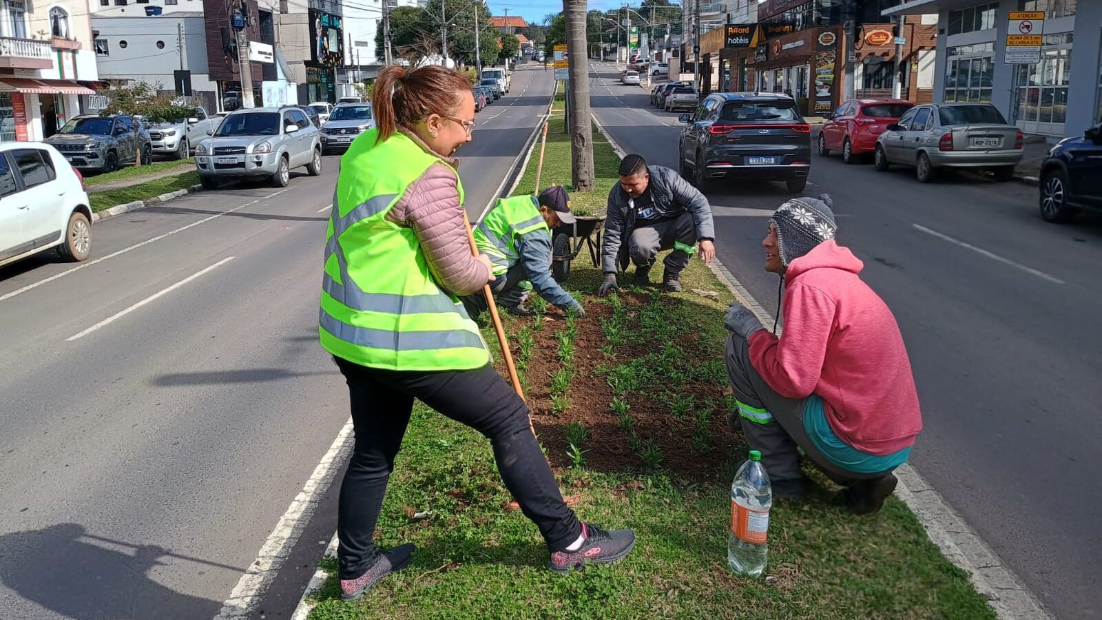 Outra frente em destaque é o serviço de jardinagem e paisagismo em rótulas espalhadas pela cidade. A manutenção inclui poda de arbustos, reposição de mudas e cuidados com o solo, preservando a beleza e o bom estado desses espaços que compõem o visual urbano de Lages.
