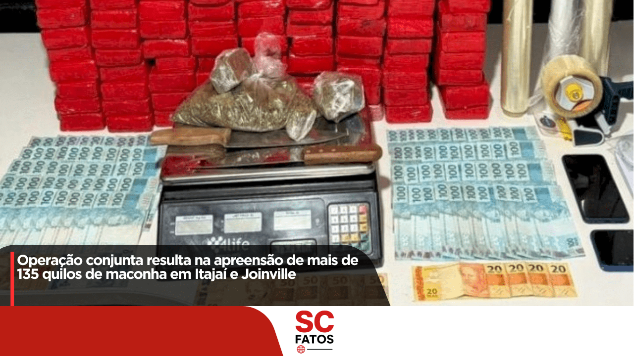 Uma operação conjunta da Polícia Militar de Santa Catarina (PMSC) resultou na apreensão de aproximadamente 135 quilos de maconha e na prisão de um homem por tráfico de drogas nas cidades de Itajaí e Joinville, na tarde desta quarta-feira (22).