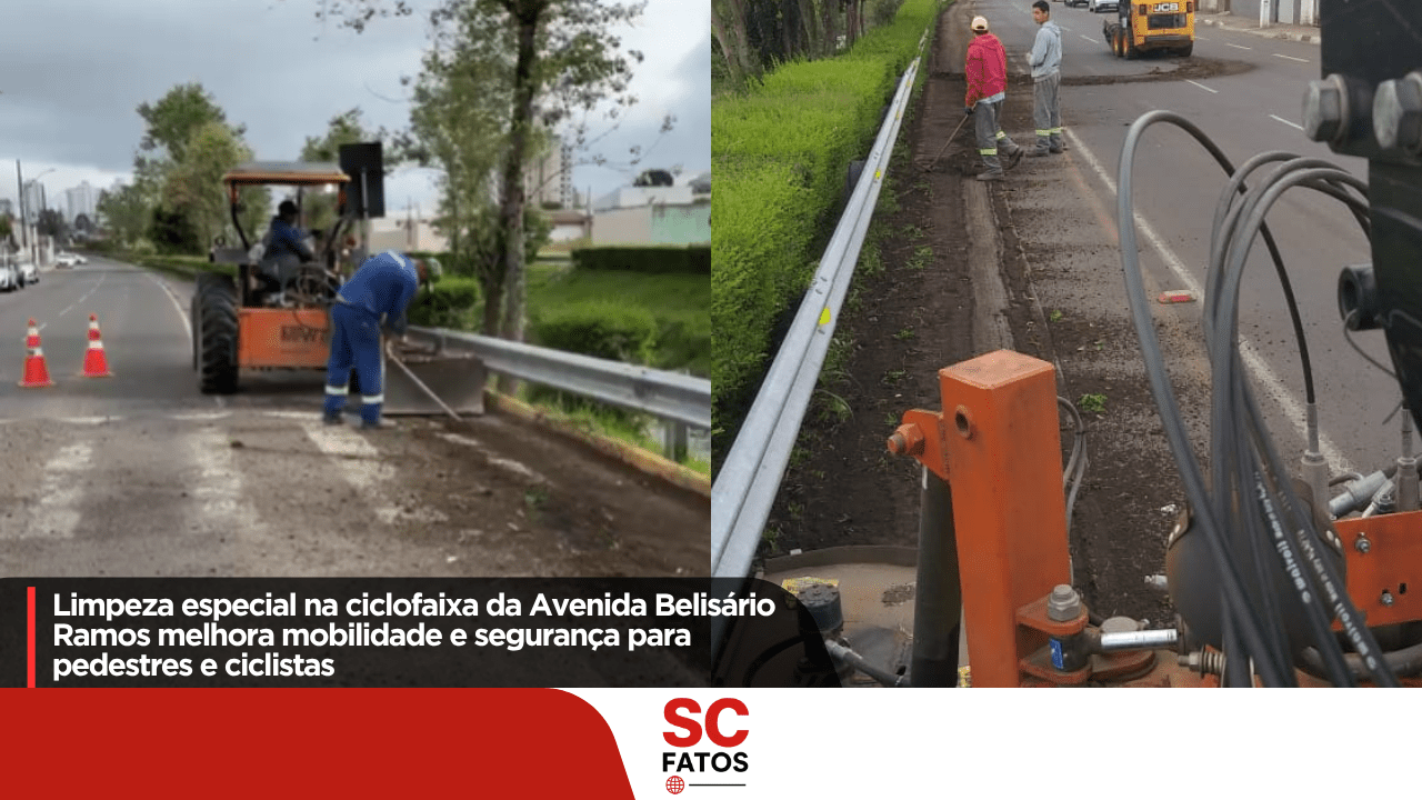 A Secretaria de Serviços Públicos executa uma ação especial de limpeza ao longo da ciclofaixa da Avenida Belisário Ramos, em Lages, no trecho que compreende desde o bairro Habitação até a interseção com a Avenida Dom Pedro II.