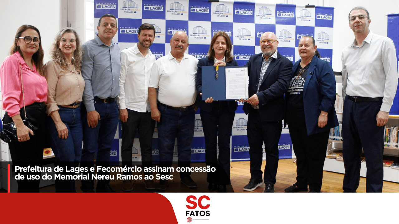 A Prefeitura de Lages e a Federação do Comércio de Bens, Serviços e Turismo de Santa Catarina (Fecomércio SC) formalizaram, nesta segunda-feira (1º de dezembro), a concessão de uso do equipamento cultural Memorial Nereu Ramos ao Serviço Social do Comércio (Sesc). A assinatura ocorreu no Centro Cultural Vidal Ramos e contou com a presença da prefeita Carmen Zanotto; da superintendente da Fundação Cultural de Lages (FCL), Carla Zonatto; do presidente da Fecomércio SC, Hélio Dagnoni; do vice-presidente da Fecomércio do Planalto Serrano, Célio Spagnoli; da diretora regional do Sesc, Simone da Rocha Batista; além de outras autoridades municipais.