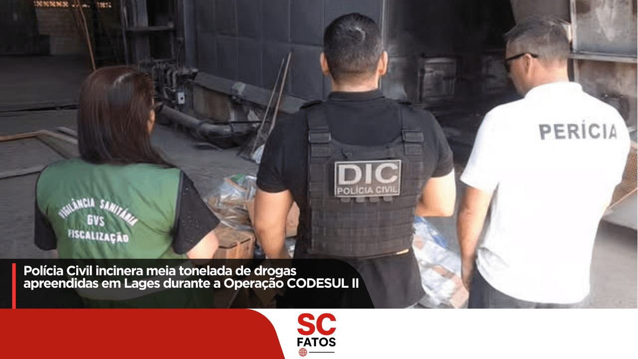 Em continuidade à Operação Policial CODESUL II, a Polícia Civil de Santa Catarina, por meio da Delegacia de Investigação Criminal (DIC) de Lages, realizou na tarde desta sexta-feira (5) a incineração de aproximadamente meia tonelada de drogas, entre maconha, cocaína, crack e outras substâncias entorpecentes.