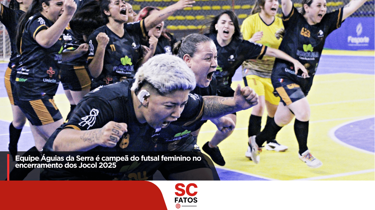 Nas cobranças, o Águias da Serra venceu por 4 a 3 e garantiu o título de campeão do futsal feminino dos Jocol 2025. A cerimônia de premiação contou com a presença do superintendente da Fundação Municipal de Esportes (FME), Tyrone Machado, e da secretária municipal de Políticas para a Mulher e para a Pessoa Idosa, Suzana Duarte.
