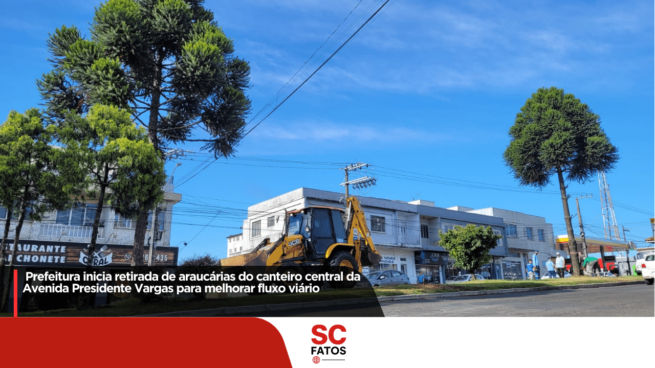 A Prefeitura de Lages iniciou a retirada parcial do canteiro central da Avenida Presidente Vargas, no trecho entre a Rua Campos Salles e a Avenida Luiz de Camões. A intervenção prevê a remoção de seis araucárias e integra um conjunto de ações voltadas à melhoria da mobilidade urbana no principal cruzamento da cidade, por onde circulam cerca de 40 mil veículos diariamente.