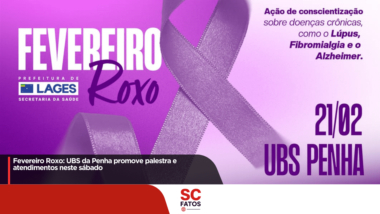A Prefeitura de Lages, por meio da Atenção Primária à Saúde, realiza neste sábado, 21 de fevereiro de 2026, uma ação especial em alusão ao Fevereiro Roxo. A programação ocorre na Unidade Básica de Saúde (UBS) do bairro Penha, com atividades das 8h às 12h e das 13h às 17h.