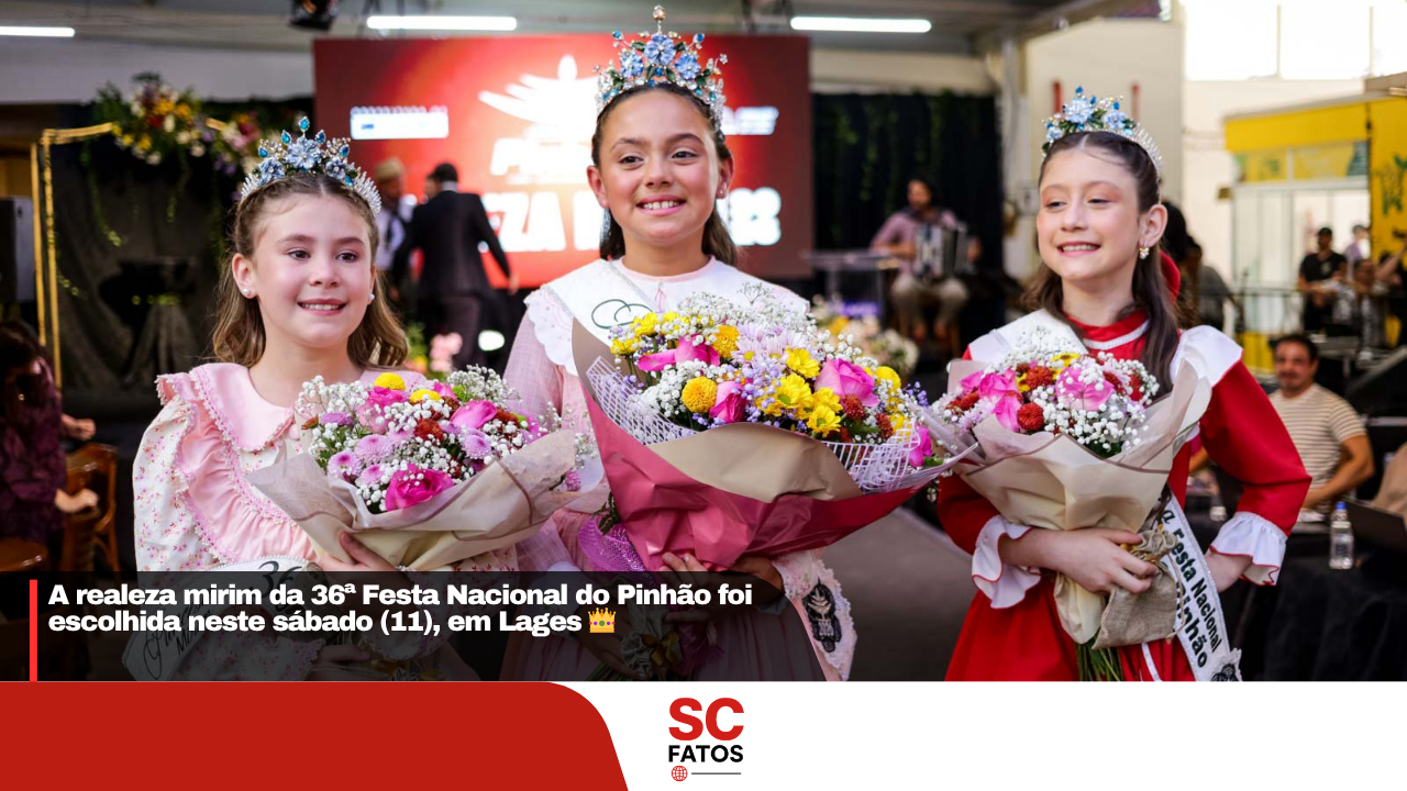 A realeza mirim da 36ª Festa Nacional do Pinhão foi definida na tarde deste sábado, 11 de abril de 2026, em evento realizado no Mercado Público Municipal Osvaldo Uncini, em Lages. Maria Laura Correa Rodrigues foi eleita Rainha Mirim, enquanto Brenda Nathyelly Ilha conquistou o título de 1ª Princesa e Maria Adelin Westphal Moro foi escolhida como 2ª Princesa.